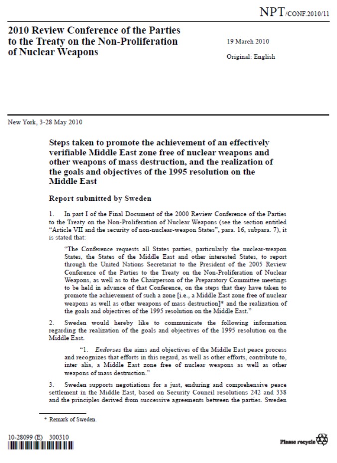 Submitted by Sweden at the 2010 NPT RevCon, this report outlines the national perspective on the creation of a Middle East Zone Free of Weapons of Mass Destruction, and on steps taken in support of implementation of the 1995 Resolution on the Middle East.