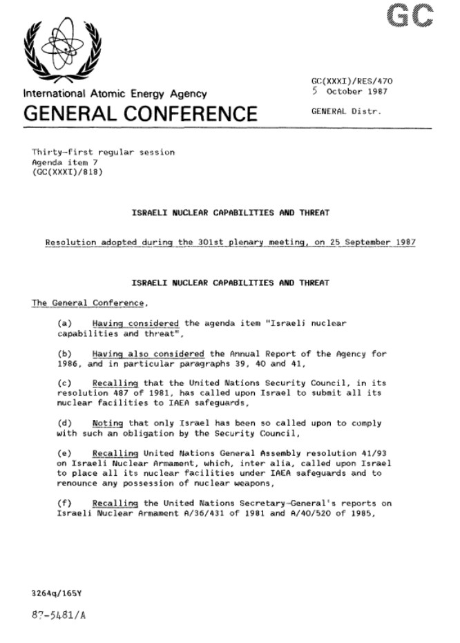 This resolution on "Israeli nuclear capabilities and threat" was adopted at the 1987 IAEA General Conference, and calls for Israel to place all nuclear facilities under IAEA safeguards. The resolution also requests that the IAEA Director General report on Israeli nuclear capabilities. This 1987 resolution makes a direct reference to "recent information regarding the possession of nuclear weapons by Israel."