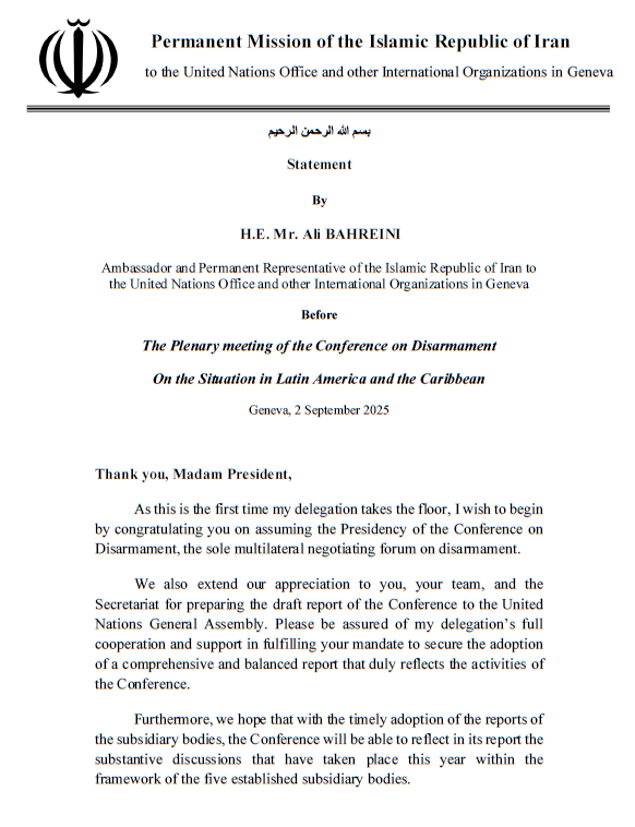 The statement notes Iran’s position that the only credible guarantee against the use of such weapons is their complete, verifiable, and irreversible elimination. Pending the achievement of this objective, the provision of unconditional and legally binding assurances of non-use and non-threat of use of nuclear weapons against non-nuclear-weapon States remains an absolute necessity.