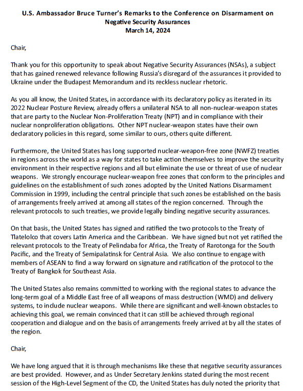 The statement reaffirms the US position on NSA, which, in accordance with its declaratory policy, as iterated in its 2022 Nuclear Posture Review, already offers a unilateral negative security assurance to all non-nuclear weapon states that are party to the Nuclear Nonproliferation Treaty and in compliance with their nuclear nonproliferation obligations. It also notes that negative security assurances are best provided through mechanisms like NWFZs.