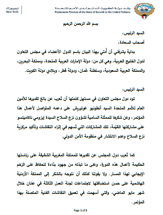 Kuwait, speaking on behalf of the Gulf Cooperation Council, welcomes the ceasefire plan in Gaza and underscores that the success of peacebuilding efforts highlights the need for a comprehensive security approach in the region, with the Zone as one of its pillars. The GCC underscores that regional security can only be achieved through collective cooperation, transparency, and compliance with international law. The GCC renews its condemnation of any statements by Israel or anyone else threatening the use of nuclear weapons. The statement reiterates the necessity of Israel’s accession to the NPT as a non-nuclear state and the submission of all nuclear facilities to comprehensive IAEA safeguards, framing these steps as indispensable for establishing the zone and regional security.