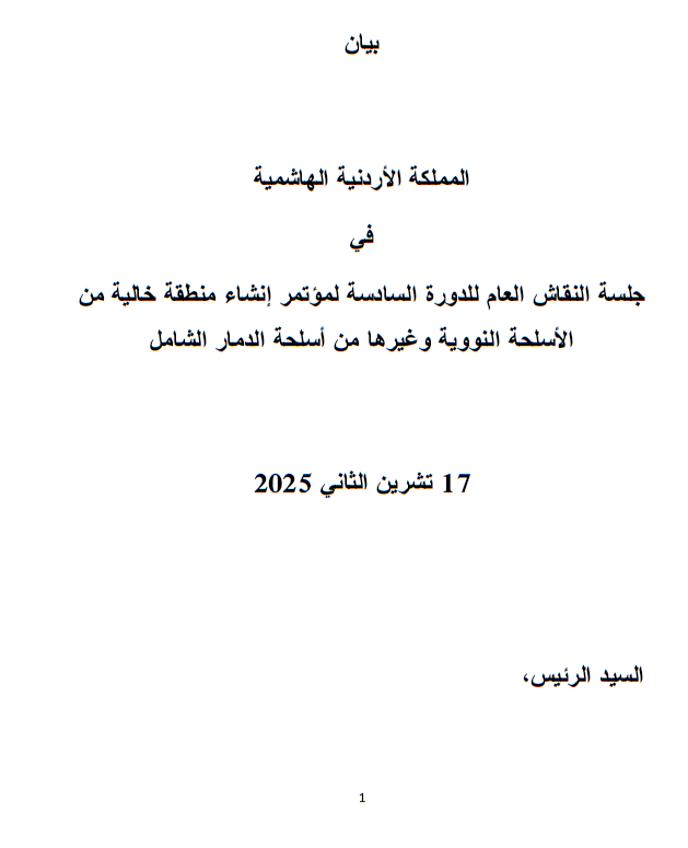 The statement by Jordan calls for leveraging lessons from existing NWFZ and developing partnerships between the conference and other zones to exchange best practices and enhance readiness for treaty negotiations. Jordan stresses the importance of dispute-settlement mechanisms and securing unconditional negative security assurances in the future treaty. It also calls for promoting practical regional confidence-building measures, including nuclear risk reduction through transparency, information exchange, and joint emergency response training.