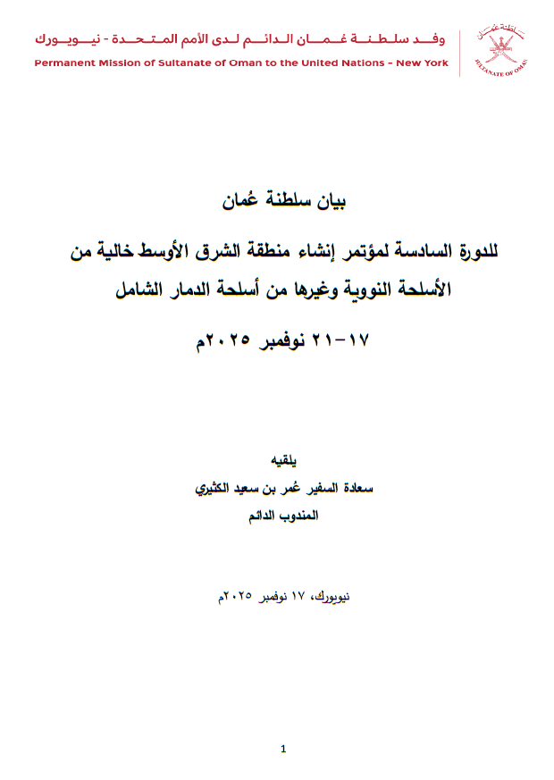 Oman stresses that establishing a Middle East Free Zone is a strategic necessity to strengthen collective regional security and stability. Addressing evolving regional challenges should not be in isolation from adopting a comprehensive regional approach based on cooperation, de-escalation, building confidence, and addressing strategic uncertainty resulting from the existence of nuclear capabilities outside international safeguards and monitoring regimes. It emphasizes that recent developments urge for a comprehensive approach to regional security, with the establishment of the zone as one of its fundamental pillars. The statement argues that sustainable peace cannot be achieved without a collective security approach that addresses the root causes of instability, foremost among which are the proliferation of weapons, the absence of common risk control mechanisms, and regional institutional mechanisms for consultation and cooperation on WMD risks.