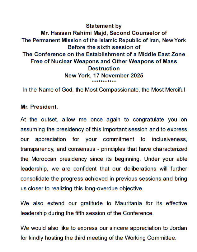 Iran’s statement identifies Israel’s possession of nuclear weapons and its non-accession to the NPT as the main obstacle to progress on the establishment of a WMDFZ. It also refers to recent developments, including Israeli attacks on Iran’s safeguarded nuclear facilities and U.S. remarks about resuming nuclear testing, as threats to disarmament efforts. The statement emphasized the need for the conference’s work to focus on negotiating a legally binding treaty to eliminate WMD in the Middle East, and cautioned against deviating from this core objective.