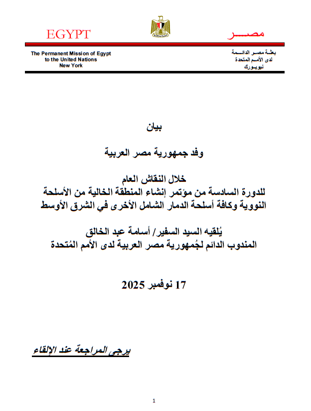 Egypt underscores the need for the 11th NPT RevCon to give the highest priority to the reaffirming past commitments on the 1995 resolution and including specific and concrete measures for the implementation of the resolution in the final document. The statement highlights Egypt’s areas of focus including highlighting the conference work at major international events, deepening engagement with academic and civil society organizations, strengthening dialogue with NWFZ, and exploring efforts to ensure participation of absent parties. The statement urges Israel to attend the conference and engage in good faith, noting that the conference does not exclude or target any state, but rather provides an opportunity for constructive regional dialogue.