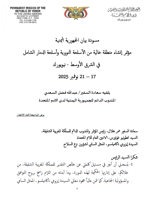 Yemen highlights the failure to implement the 1995 resolution and insists that all regional States must participate in the conference, particularly Israel, which continues to refuse joining the treaty and placing its nuclear facilities under IAEA safeguards. It condemns Israel’s recent statements and threats to use nuclear weapons against civilians in Gaza and calls for a unified international stance. The statement urges Iran to comply fully with the Joint Comprehensive Plan of Action and Security Council Resolution 2231 and ratify the Additional Protocol. Yemen advocates for negative security assurances from nuclear-weapon States as a pillar of mutual confidence to address legitimate regional security concerns.
