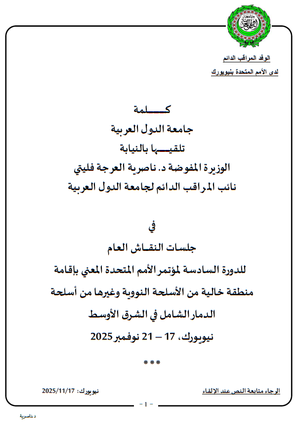 The League of Arab States denounces in its statement the threats made by senior Israeli officials to use nuclear weapons against Gaza and highlights the devastating impact of Israeli aggression on Palestine, Syria, Lebanon, Yemen, and Qatar. The LAS urges the three co-sponsors of the 1995 resolution, especially the United States, to uphold their responsibilities, engage positively, pressure Israel to attend the conference and accede to the NPT, and place its nuclear facilities under the IAEA safeguards. The LAS calls for greater involvement of regional organizations, including the Arab League, in all substantive sessions of the conference.