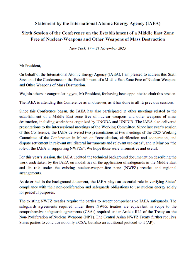 The IAEA statement reports on the presentations and reports it delivered since the last session. The IAEA underscores its responsibility for verifying compliance with non-proliferation obligations and ensuring nuclear energy is used exclusively for peaceful purposes. It explains that nuclear-weapon-free zone treaties require comprehensive safeguards agreements equivalent to those under the NPT, with some treaties also mandating the Additional Protocol. The statement provides recent developments on safeguards agreements and protocols in the region.