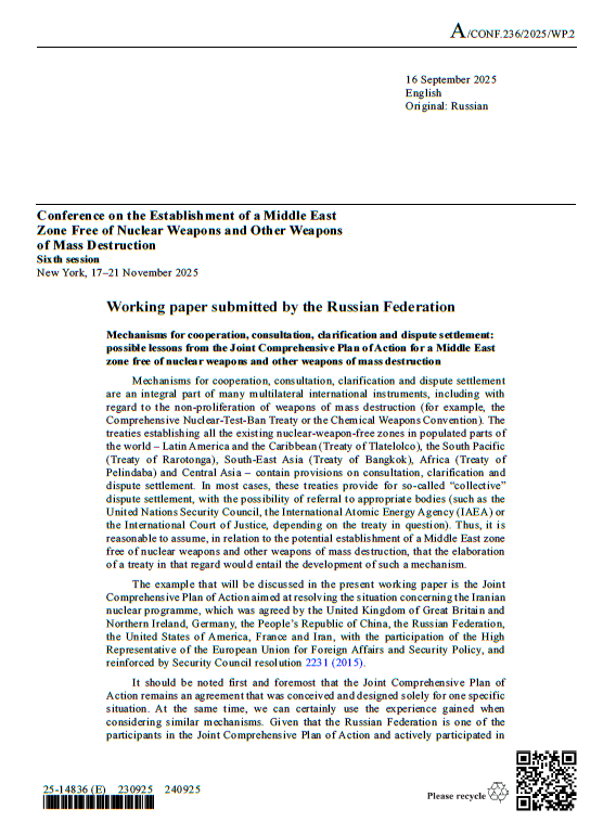 The working paper, submitted by the Russian Federation, explores mechanisms for cooperation, consultation, clarification and dispute settlement for a future Middle East zone free of nuclear weapons and other weapons of mass destruction treaty. It draws lessons from the Joint Comprehensive Plan of Action (JCPoA). The paper explains that the JCPoA created a Joint Commission to monitor compliance and resolve disputes, allowing Iran to raise issues such as delays in lifting sanctions and nuclear-related concerns. It describes the JCPoA as a multistage dispute-settlement process designed to reduce tensions and preserve the agreement despite deep distrust among parties.